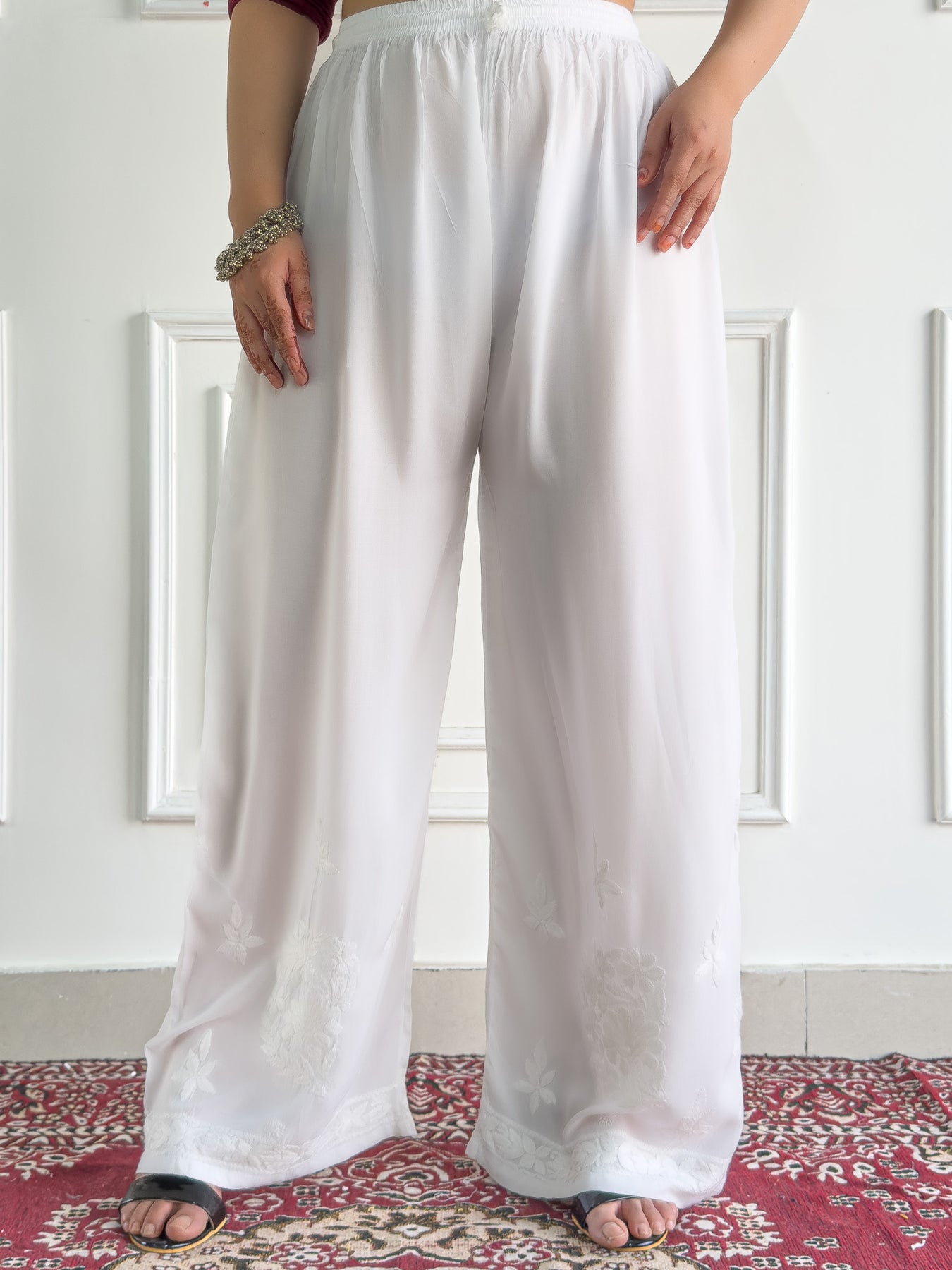 Soft modal white palazzo with chikankari embroidery.