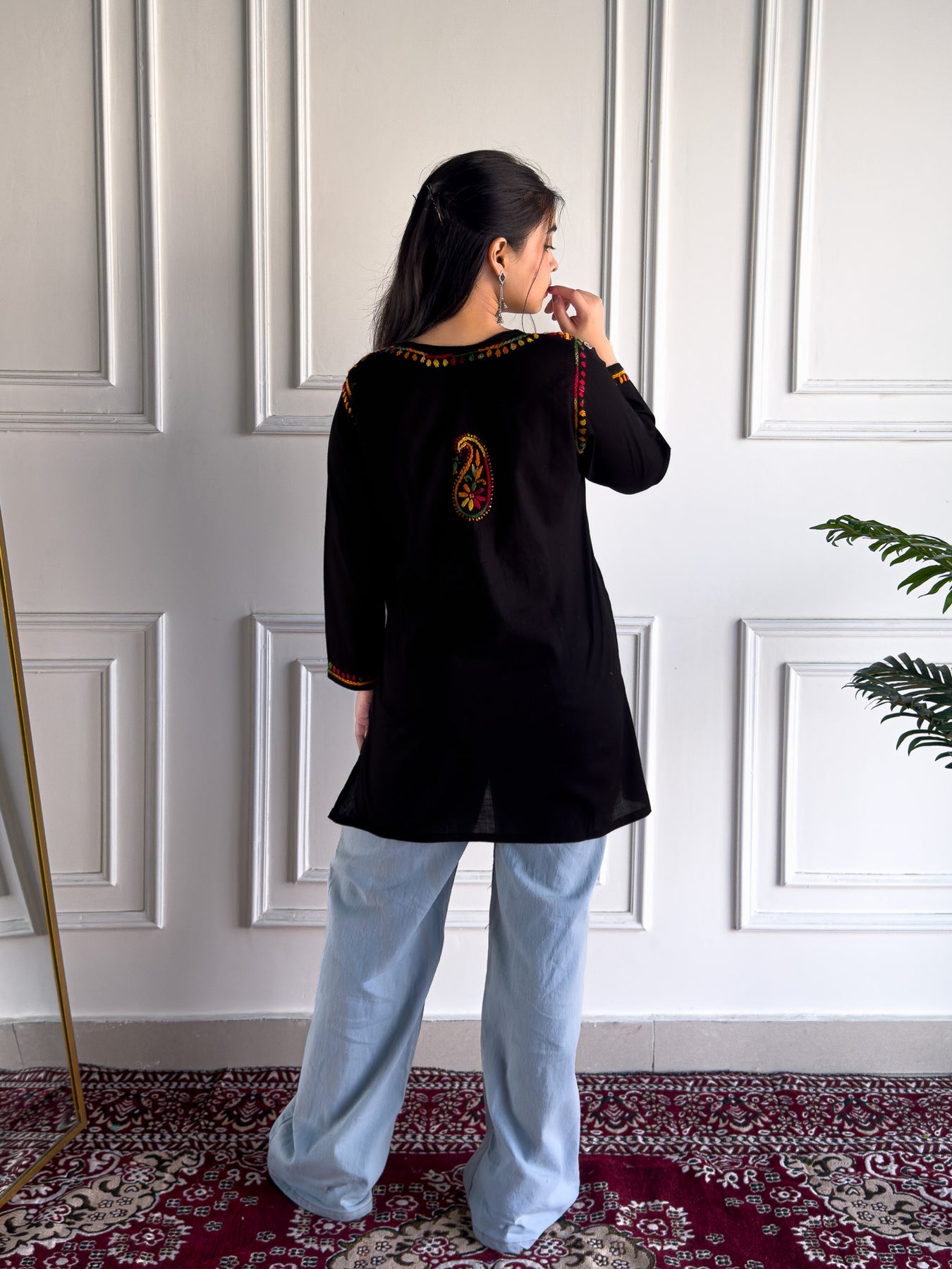 Embrace Timeless Grace with the Veda Cotton Chikankari Black Multi Short Kurti